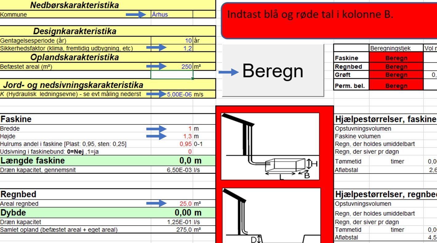 - Størrelserne (bredde, højde, areal) under hhv. faskine eller regnbed skal indtastes.