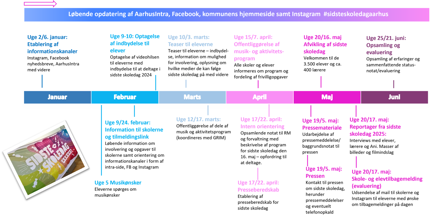 Tidsplanen for kommunikation i tekstform - Løbende opdatering af AarhusIntra, Facebook, kommunens hjemmeside samt Instagram #sidsteskoledagaarhus