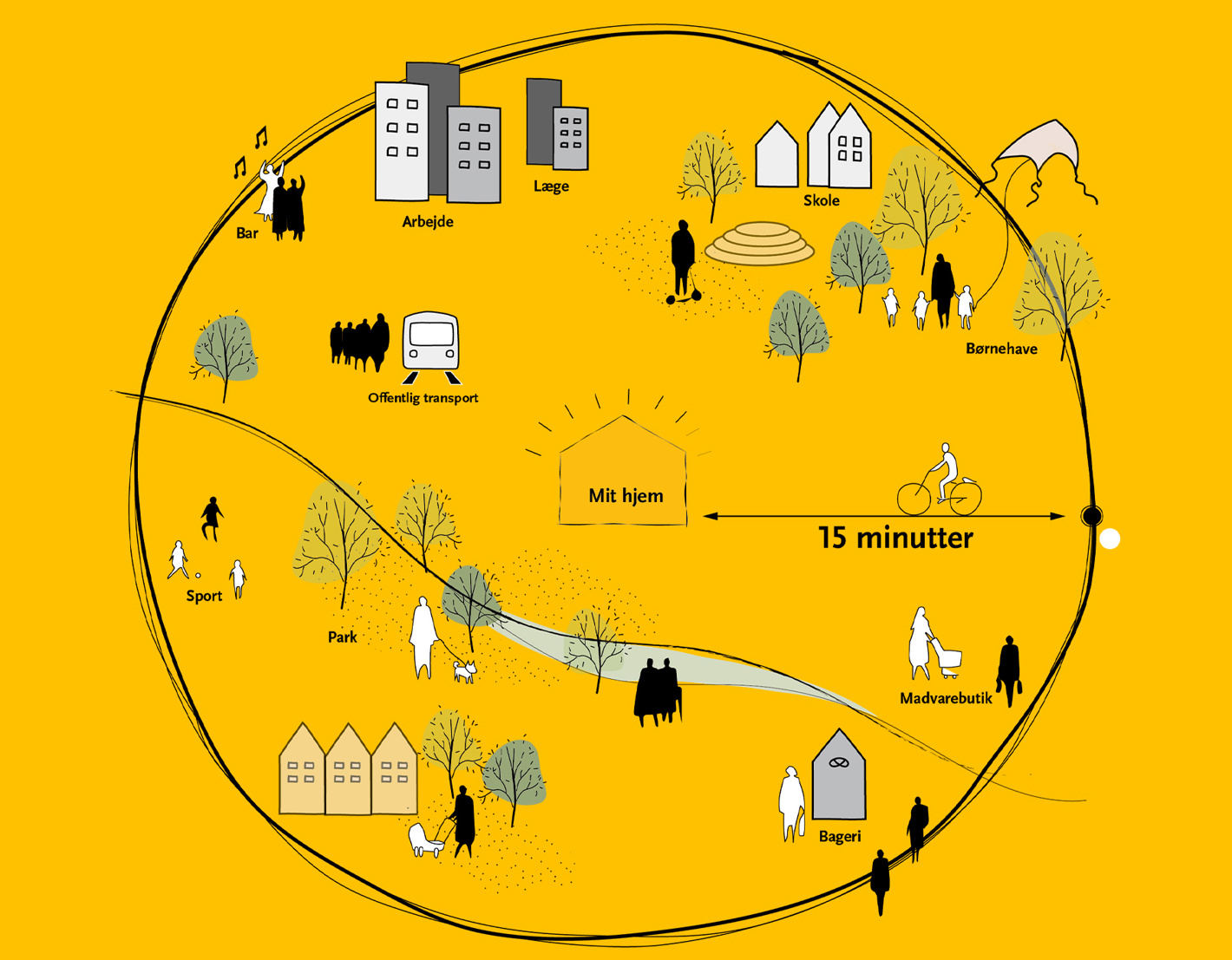 At planlægge Aarhus efter 15-minutters byen som koncept vil sige, at vi skal udvikle lokalsamfund, så dine daglige gøremål er inden for 15 minutter til fods eller på cykel – eller du kan hoppe på en effektiv kollektiv transport inden for 15 minutter.