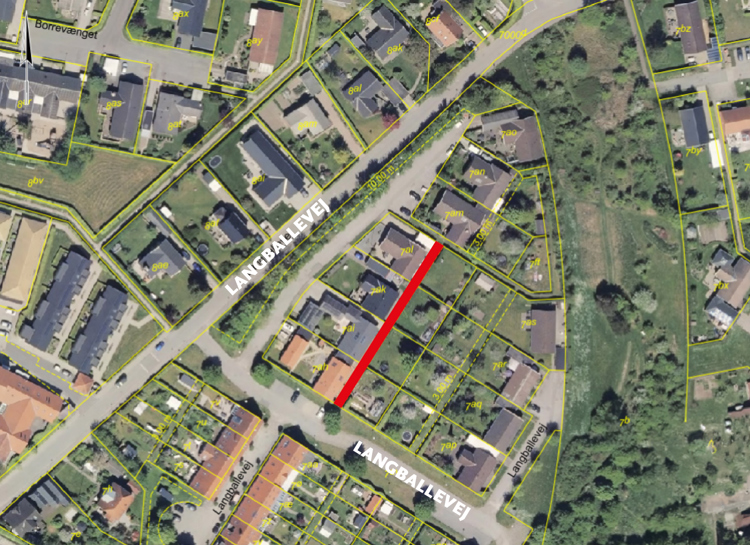 Aarhus Kommune har den 16/6 2025 modtaget et ønske om at nedlægge den private fællessti på ejendommene Langballevej 72, 74, 76 og 78 i 8320 Mårslet. Stien, der ønskes nedlagt, er markeret med rødt på kortet nedenfor.