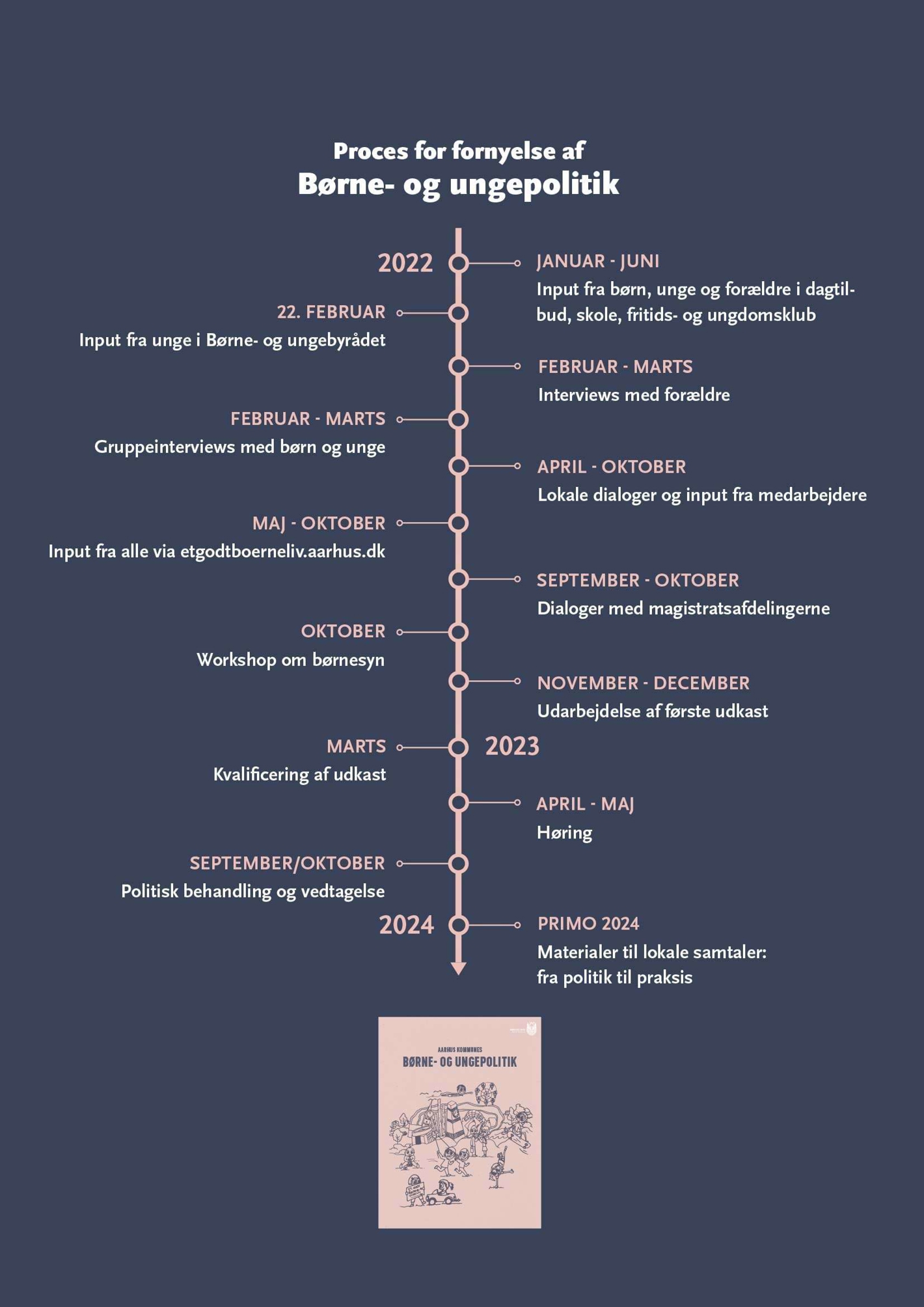 Fornyelsen af børne- og ungepolitikken tager udgangspunkt i børnenes, de unges og forældrenes stemme fra samtaler med grupper af børn og unge i alderen 5-17 år samt forældre fra et bredt udsnit af Aarhus i foråret 2022. Deres perspektiver er samlet i ”Samtalen om det gode børneliv”, der har dannet udgangspunktet for lokale dialoger gennem resten af 2022 i dagtilbud, skoler, fritidstilbud og forvaltningen om vores fælles værdier, børnesyn, og hvordan vi skaber de bedste rammer for børn og unge.