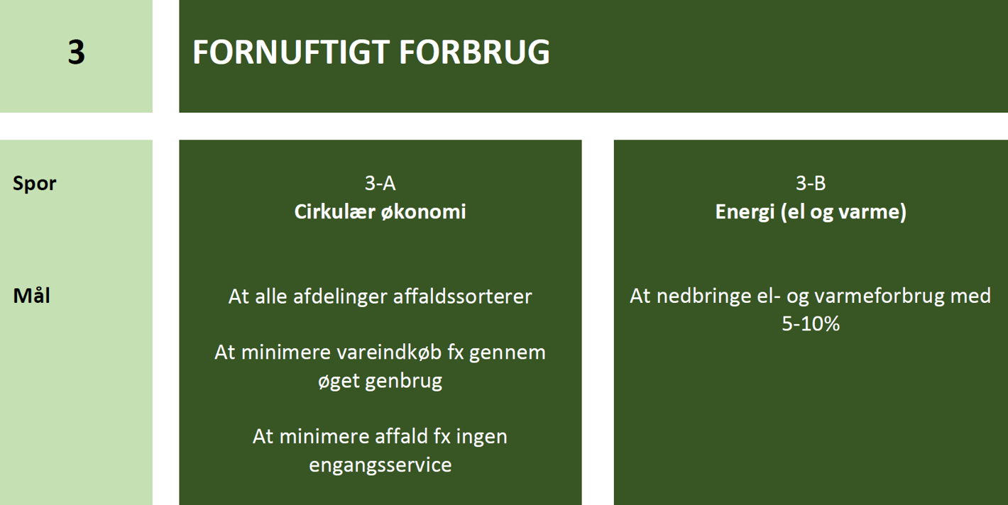 Konkrete mål: Vellykket implementering af affaldssortering i 10 fraktioner. At reducere brug af engangsservice. At flere afdelinger kender og bruger Genbrugsportalen – både når de mangler produkter, og når de har noget i overskud, som kan genbruges af andre.