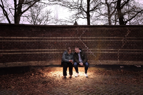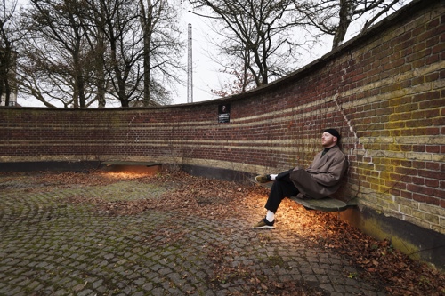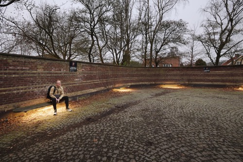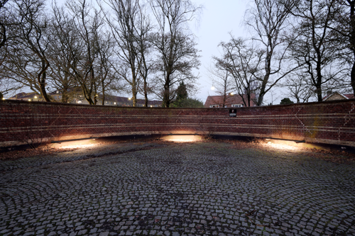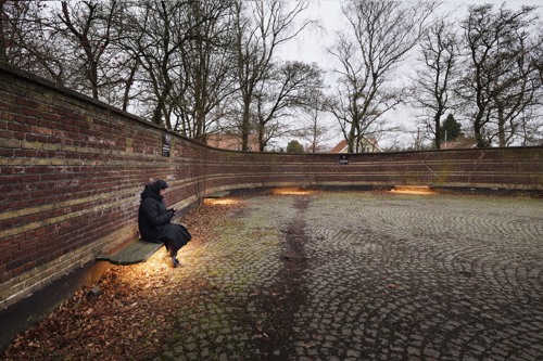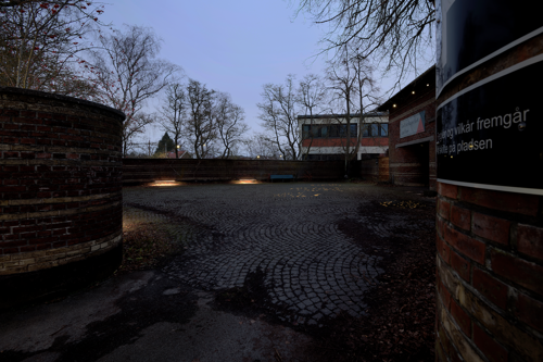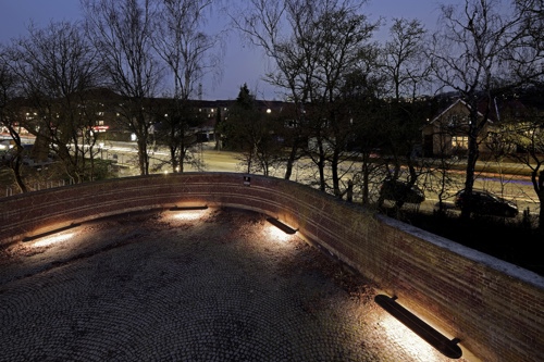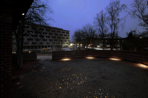 Lavmælt belysning under bænkende inviterer de besøgende til at sidde og reflektere i de naturlige omgivelser, med træer og anden bevoksning der omkranser gården.