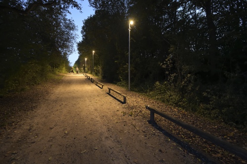 Når stien ikke bruges, ulmer lyset på lavt blus, for at sikre et godt snit mellem mørke og tryghedsskabende lys, langs dette naturstræk.