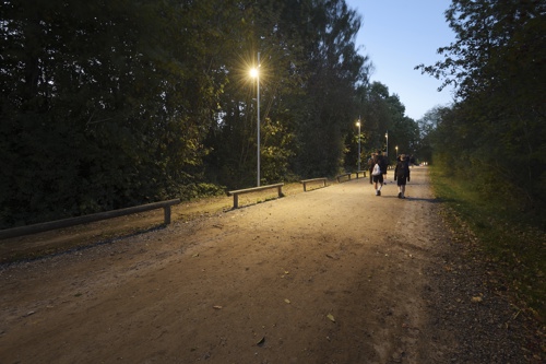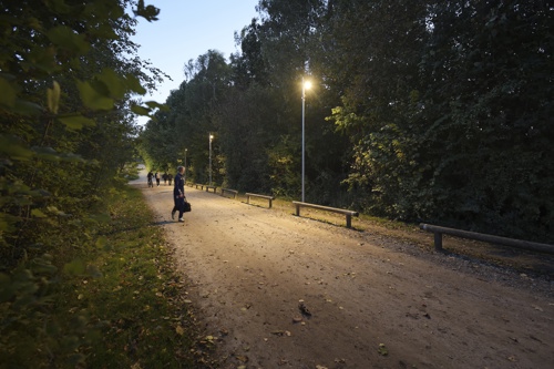 Helt standard gadebelysningsmateriel og sensorer er monteret langs stien her, men koblet sammen med et fleksibelt styringssystem. Via Lumina, som Kollision har døbt systemet, skræddersyer belysningen til individerne der går langs forløbet i realtid, på en måde hvor lyset indhyller trafikanten og skaber en tryg atmosfære, før lyset dæmpes igen.