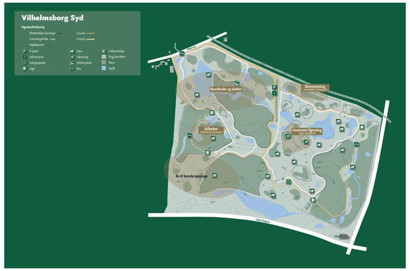 Det nye naturområde syd for Vilhelmsborg bliver med tiden en mosaik af plantet skov, selvgroet skov, vandhuller og enge med græssende dyr. Området bliver flettet sammen med lange kig gennem busk- og skovlandskabet, som sikrer, at udsynet til det kuperede landskab og de kulturhistoriske træk bliver bevaret for eftertiden. Her bliver både midlertidige hegn, der skal beskytte nyplantet skov og permanente hegn til græssende dyr, som hjælper med at pleje engene og holde dele af området lysåbent. Med tiden vil vi udvide den eksisterende hegning til at omfatte et område på ca. 30 hektar. Vi ønsker at overlade større dele af området til naturlig tilgroning frem for udelukkende at planlægge traditionel skovrejsning med planlagte lysninger og fortætninger. I samarbejde med landskabsarkitekt Nané Køllgaard Pedersen vil vi have et stort fokus på at få stenene tilbage i landskabet.
