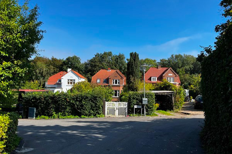 Vejene er smalle og snoede. De store villaer er trukket langt tilbage på grunden. Forhaverne har grønne bede og store træer. Det er tydeligt, at området er stærkt inspireret af den engelske haveby-bevægelse.