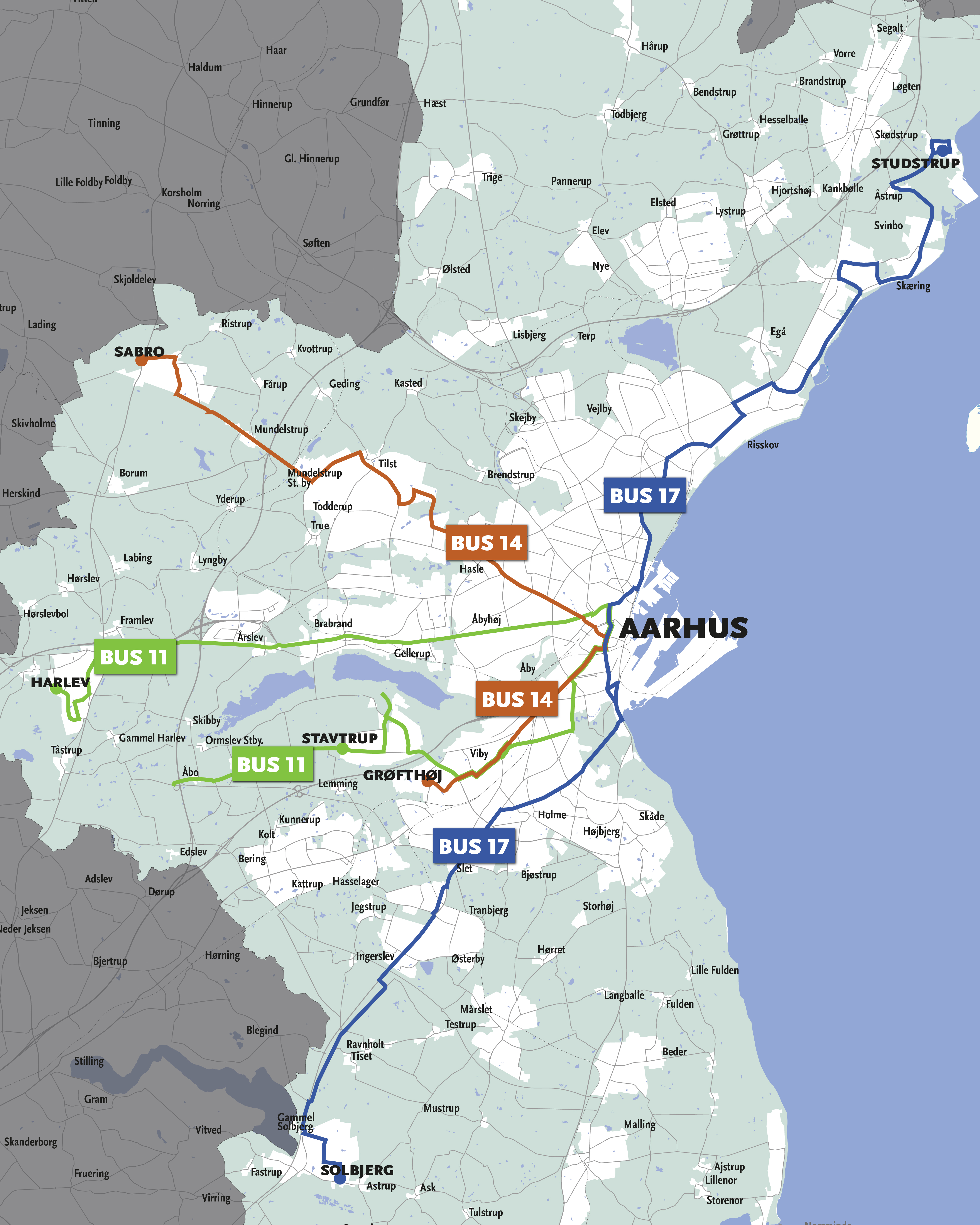 - Linjerne dækker bl.a. følgende områder i Aarhus Kommune: Harlev, Årslev, Brabrand, Åbyhøj, Viby, Stavtrup, Ormslev, Sabro, Tilst, Aarhus V, Hasle, Grøfthøj, Studstrup, Skæring, Egå, Risskov, Trøjborg, Holme, Tranbjerg, Solbjerg m.fl. Alle tre linjer kører gennem Aarhus Midtby på sin rute.