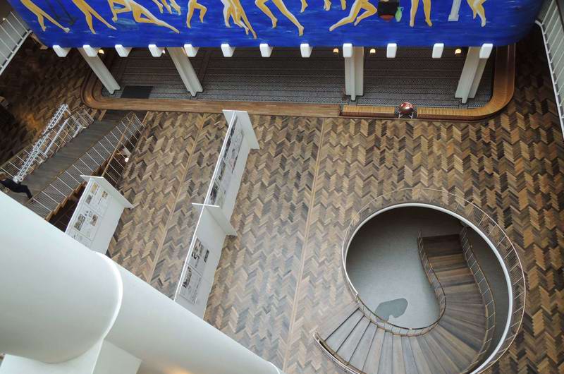 De udvendige marmorplader blev brudt i den lille by Porsgrunn i Sydnorge. De blev fragtet til Nordnorge for at blive skåret til plader og skulle derefter sejles til Aarhus. Da første sending kom, måtte skibet på grund af isvinteren losse i Grenå. Skibet forliste senere ved en minesprængning. Anden sending kom frem som planlagt med et nyt skib, der dog undervejs havde undveget fem bomber. Tredje og sidste sending blev fragtet fra Porsgrunn med tog til København, hvor det blev skåret op og kom videre til Aarhus. Der var således gennem hele processen problemer med at få marmoren frem.Interiør