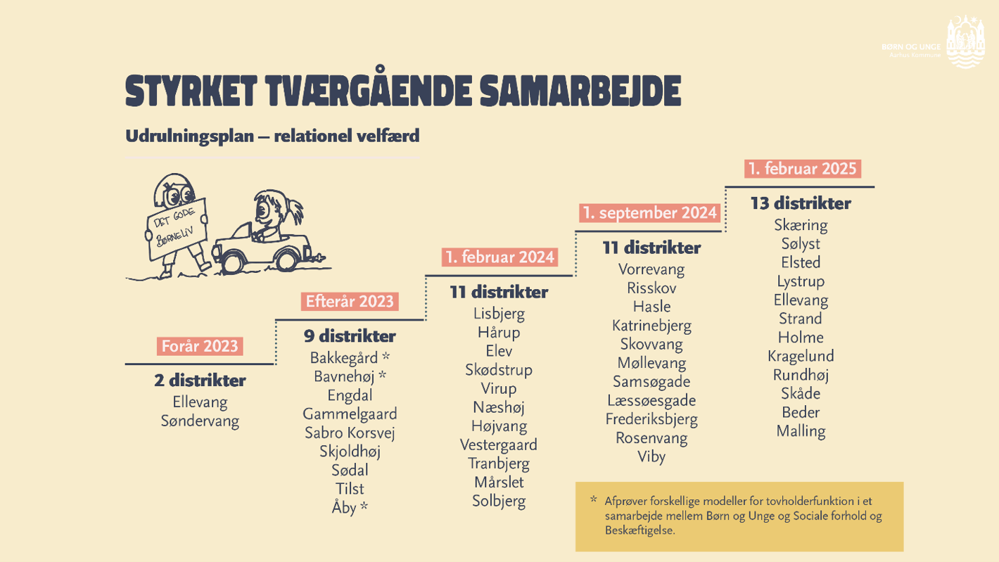 Frem mod 2025 rykker nye tværfaglige teams med myndighedsrådgivere og udførere fra Sociale forhold og Beskæftigelse helt ind i alle skoledistrikter i Aarhus. De nye teams samarbejder lokalt med familier, PPR og Sundhed samt pædagogisk personale tæt på børnene og de unge.