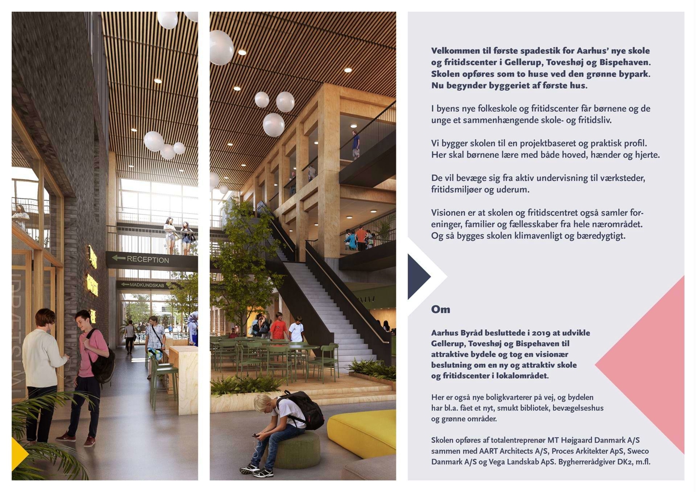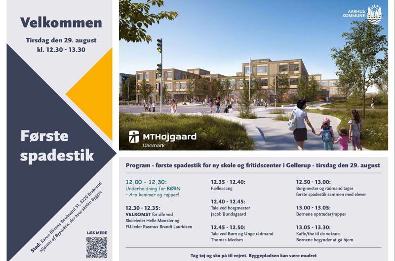 Velkommen til første spadestik for byggeriet af fremtidens skole og fritidscenter for børnefamilier i Gellerup, Toveshøj og Bispehaven. Borgmester Jacob Bundsgaard og rådmand for Børn og Unge Thomas Medom tager første spadestik sammen med en gruppe børn fra området.