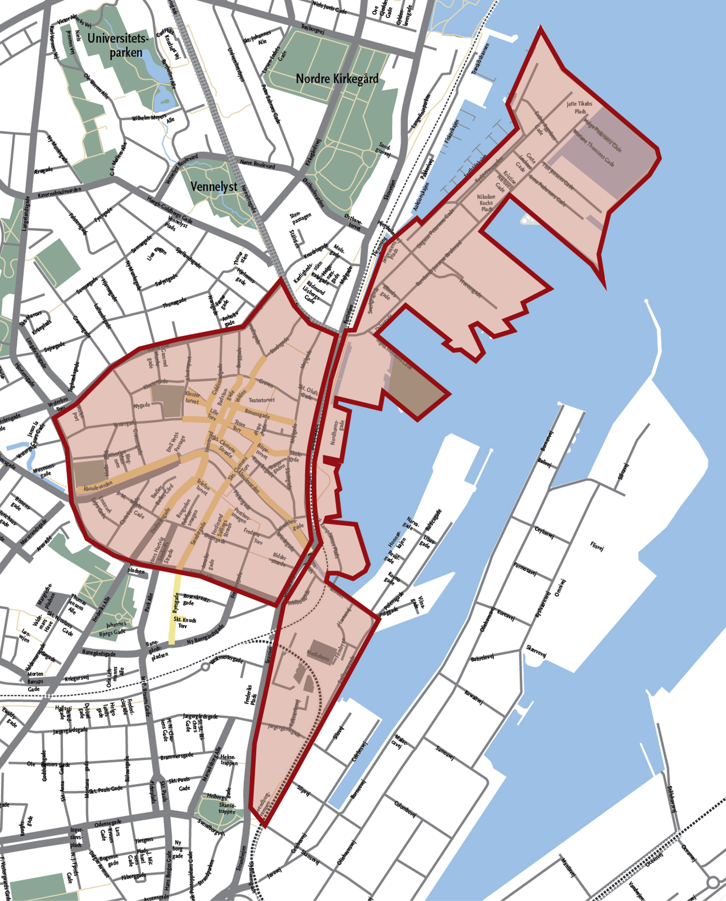 På de markerede områder på kortet nedenfor i Aarhus Midtby, kan der stilles særlige krav til belægningstyper i kabelbrøndes dæksler. Der kan være yderligere områder, der ikke er vist på dette kort.