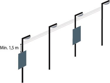- Højere end 1,5 m under laveste strømførende ledning målt fra øverste kant af plakaten.