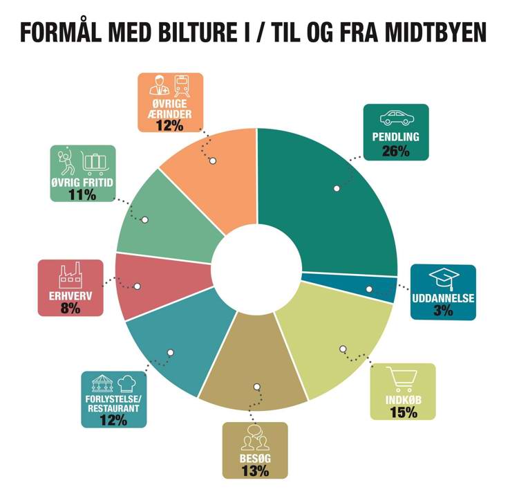 Selvom kørsel til og fra arbejde står for langt det meste af den trængsel, vi oplever på vejene i myldretiden, så udgør pendling kun omkring 1/4 af den samlede transportaktivitet med bil. Udenfor myldretiden bruger vi nemlig bilen til en lang række andre formål.