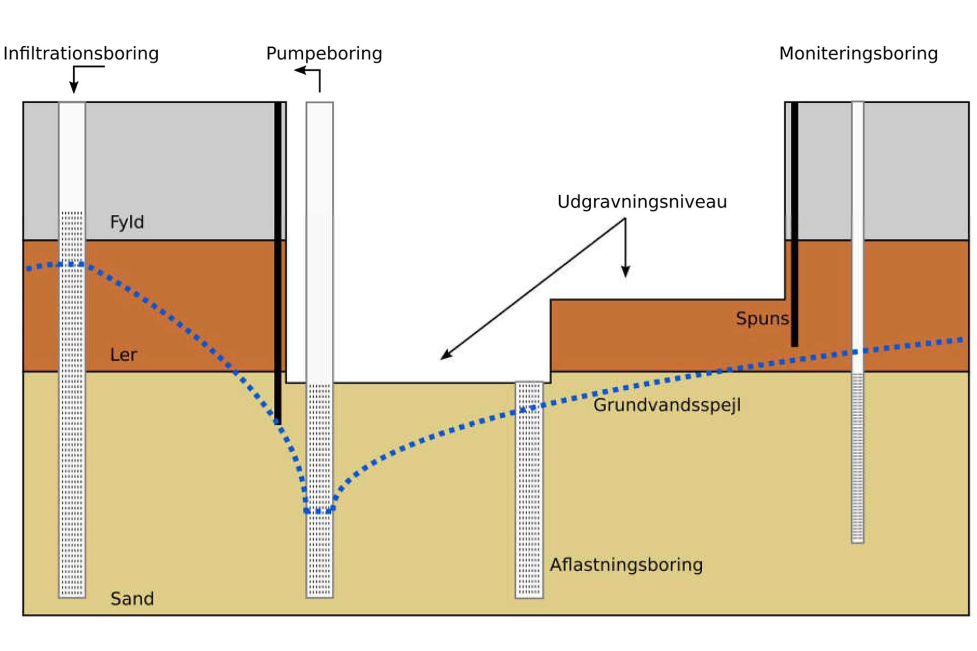 - Metode for grundvandssænkning, fx sugespidser, filterboringer, pumpesump etc.
