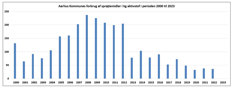 Al forbrug af sprøjtemidler på Aarhus Kommunes arealer er nu ophørt, og som det ses af grafen, var forbruget i 2023 således 0 kg.